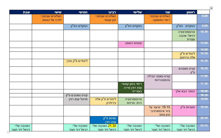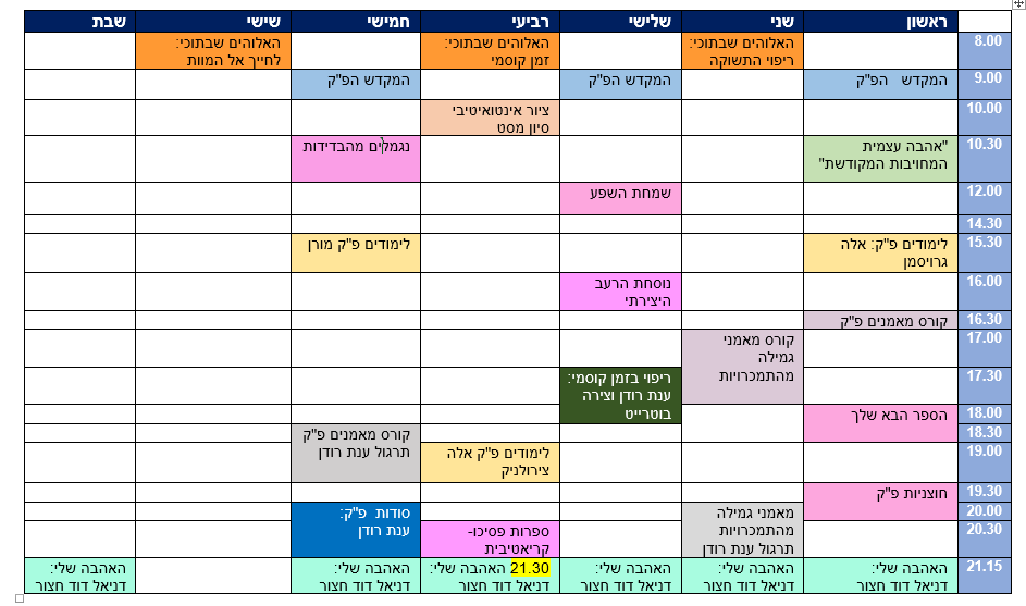 במהלך השבוע מתקיימים שלושה שיעורי לימוד בזום עם ד"ר פינקי פיינשטיין, הפתוחים לקהל הרחב וגם מוקלטים. בשיעורים אלה אנחנו גם מדגימים את שיטת הלימוד המייחדת את העולם הפסיכו-קריאטיבי, שיטה שיש בה שמחה, עונג וחיבור של האדם אל החוכמה הטבעית שלו.